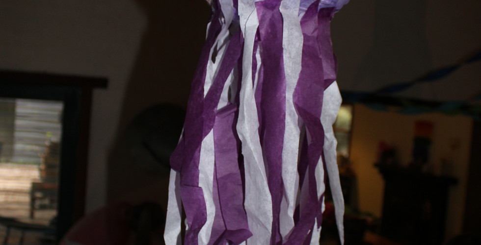 All the guests had to come dressed as 'something to do with the ocean'. I wanted to keep it broad as some people don't always like dressing up, and under the sea can be a little hard if you don't always want to go all out like me! My jellyfish costume is below. My costume was made out of a sombrero covered in pillow stuffing and the covered by a large piece of blue material. The strips hanging from the hat were a mix of bubble wrap, material strips and streamers.