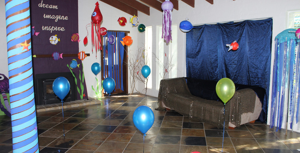 I made a selection of under the sea creatures out of paper mache such as a whale, a squid, a shark and a dolphin. Helium balloons were stuck on strings all over the floor to create a watery feel and build some depth in the event space. Fish made from paper plates were hung from the roof and stuck onto the walls, and little paper starfish were stuck all over the room and covered the tables. I even covered a bean bag in purple material and added stockings stuffed with news paper underneath to create an octopus looking creature.